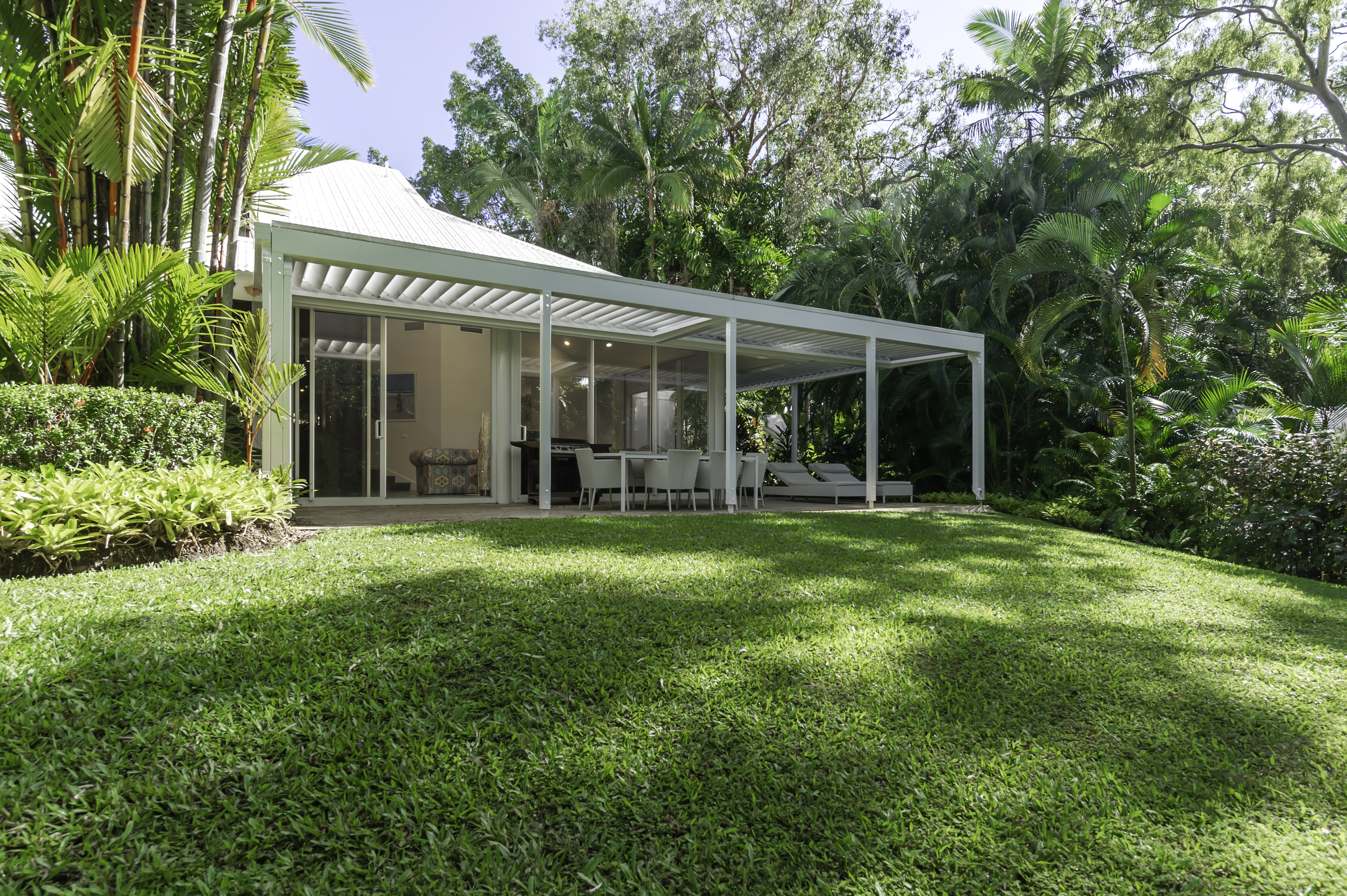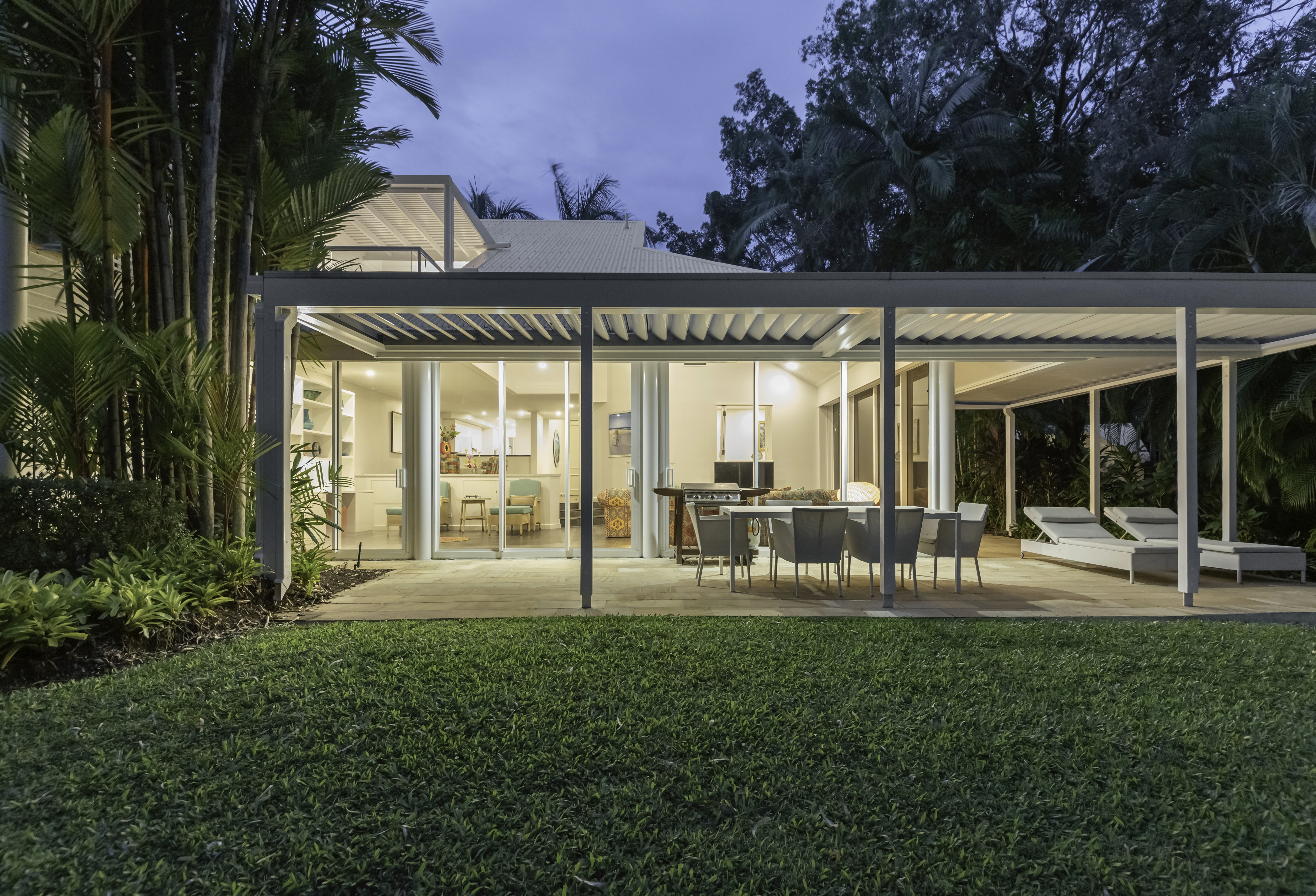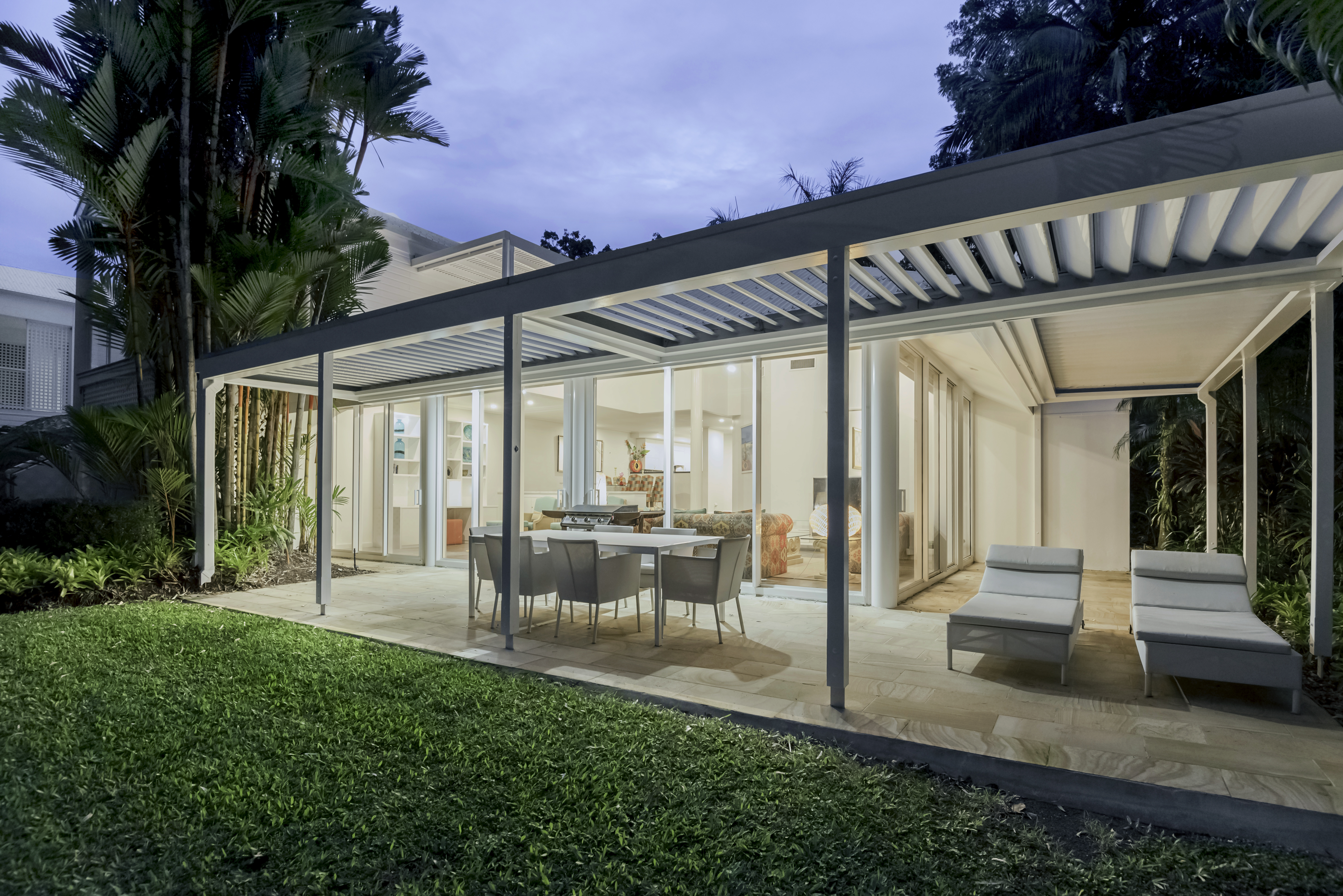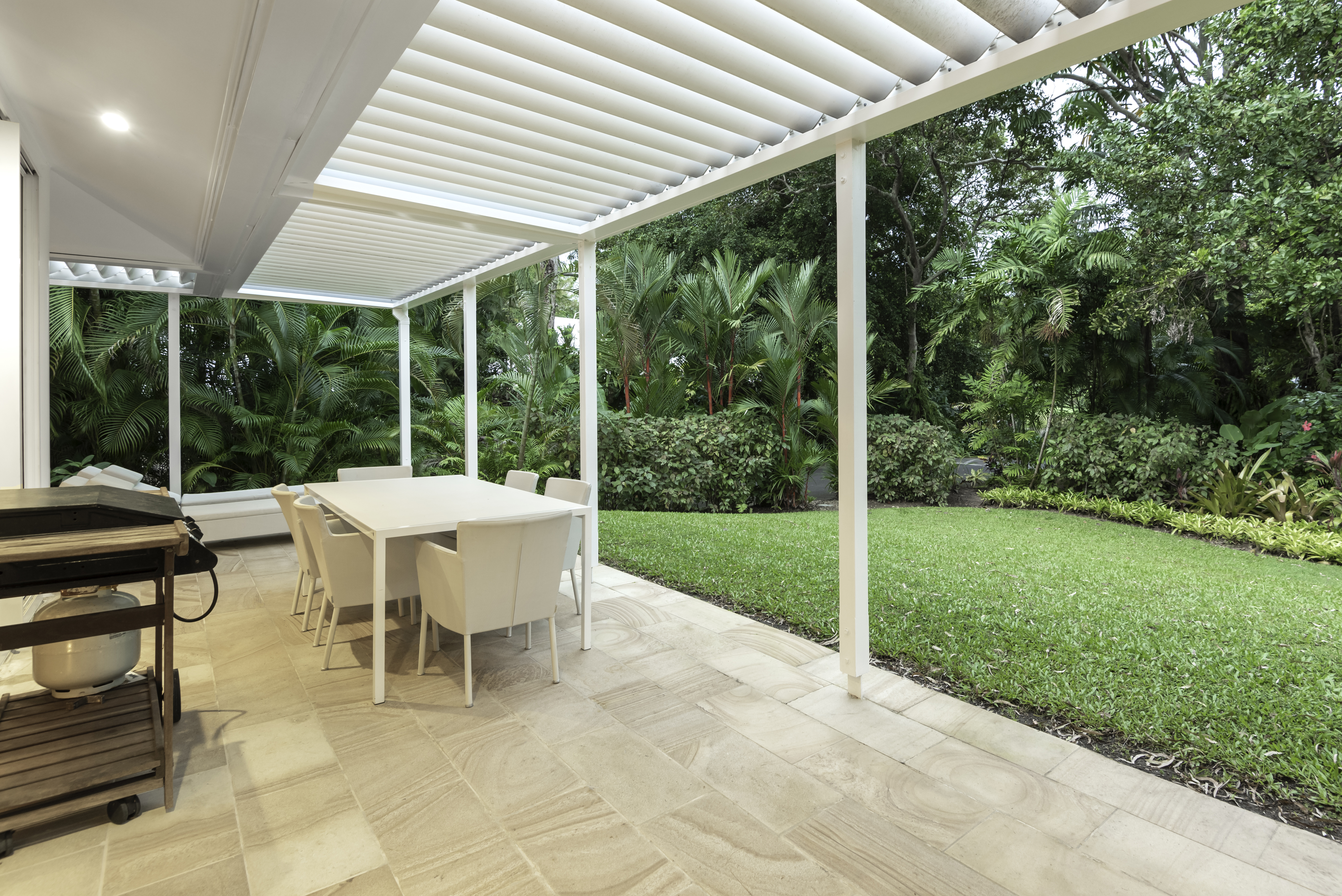 The wrap around verandah is covered by an all weather roof - motorised and able to be opened up for filtered shade or closed in the rain – perfect for the tropics