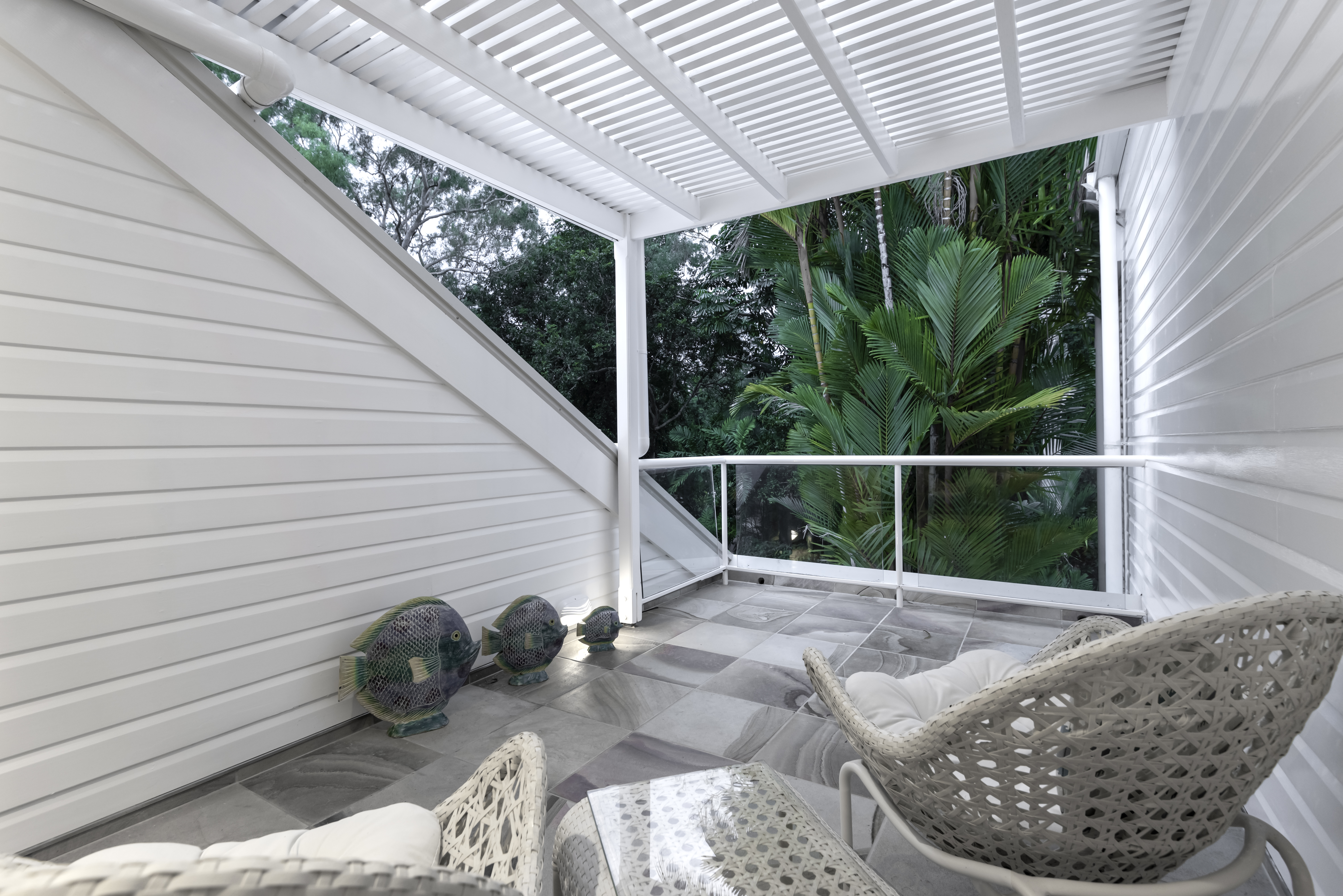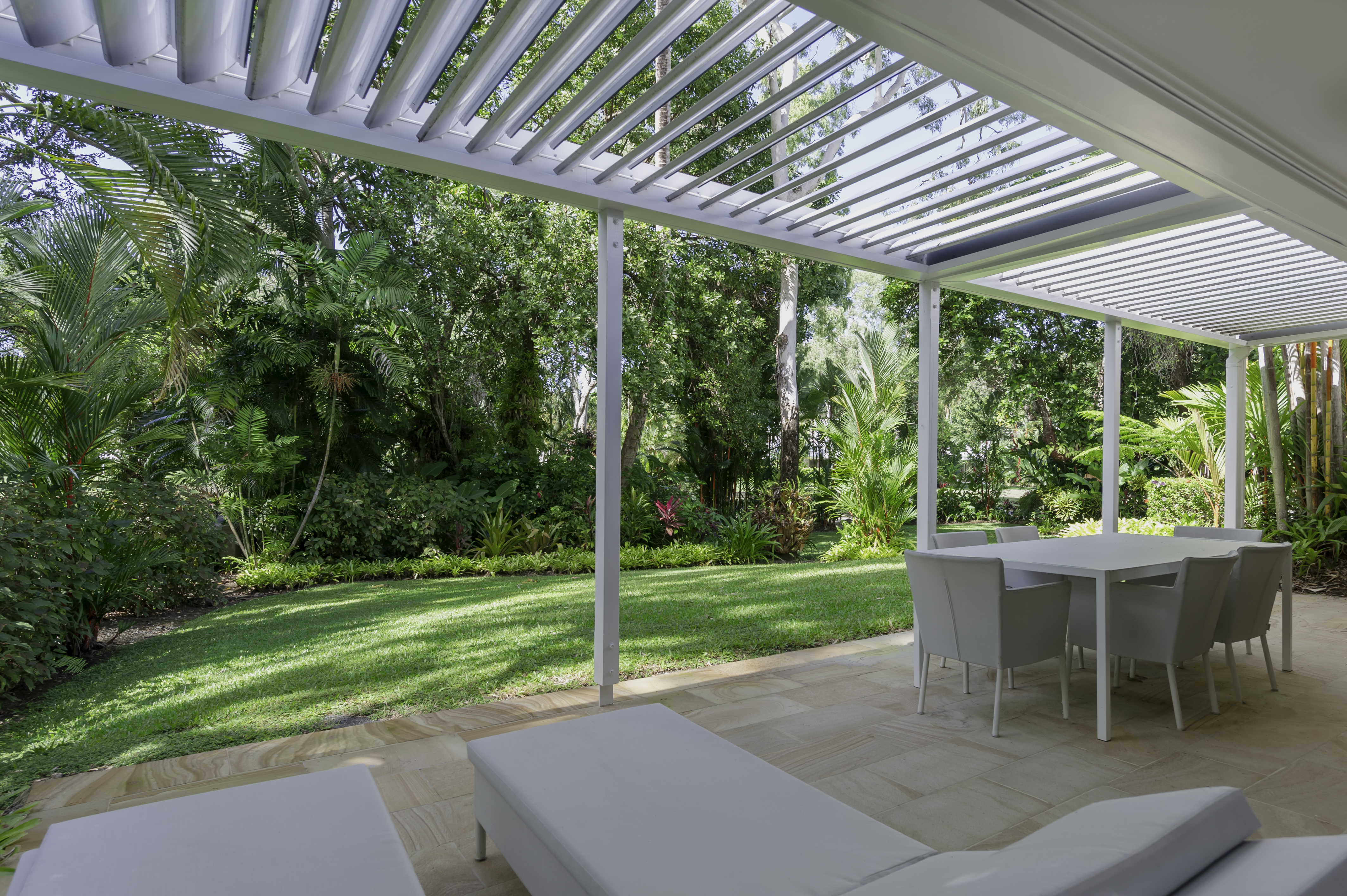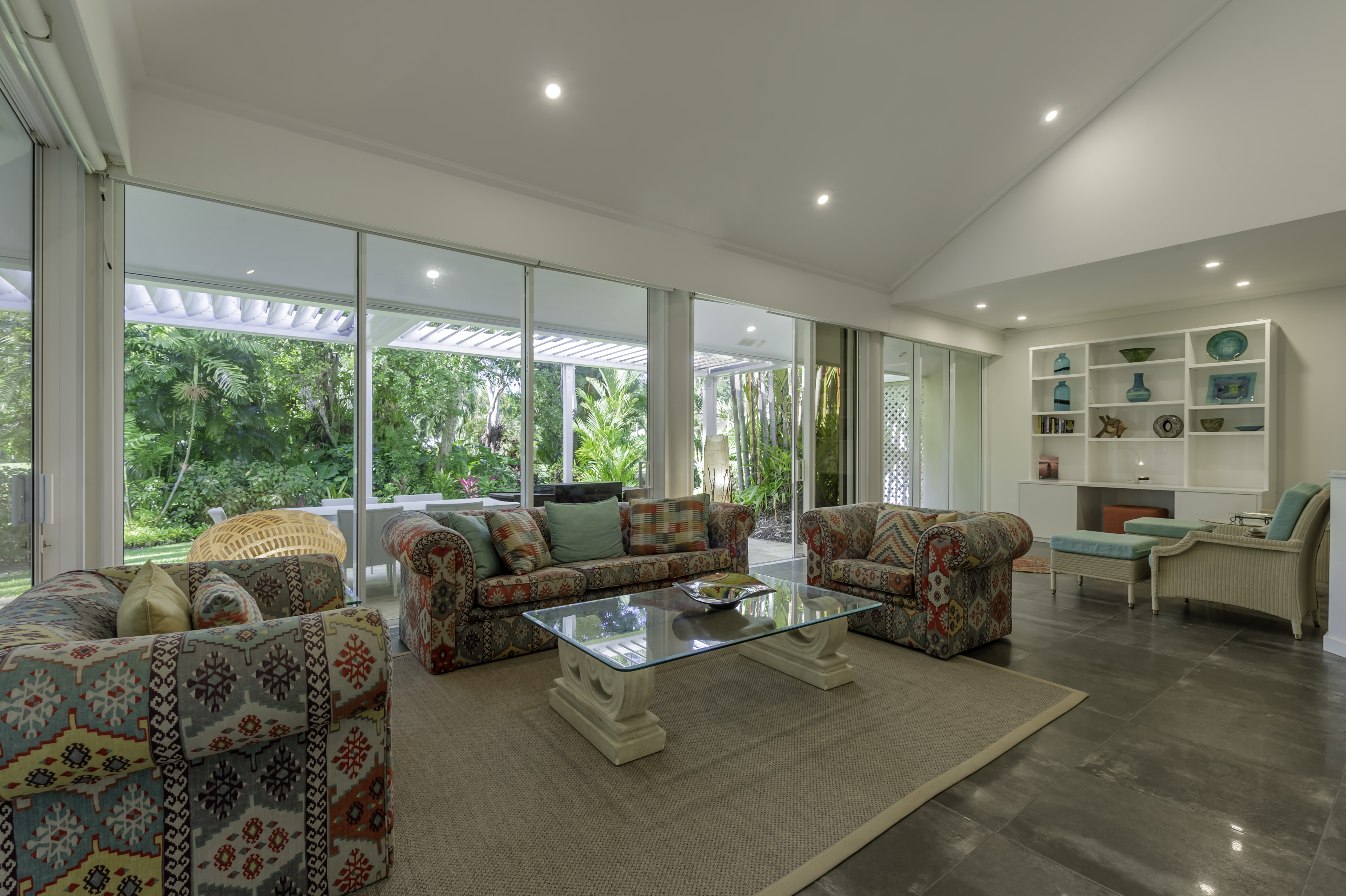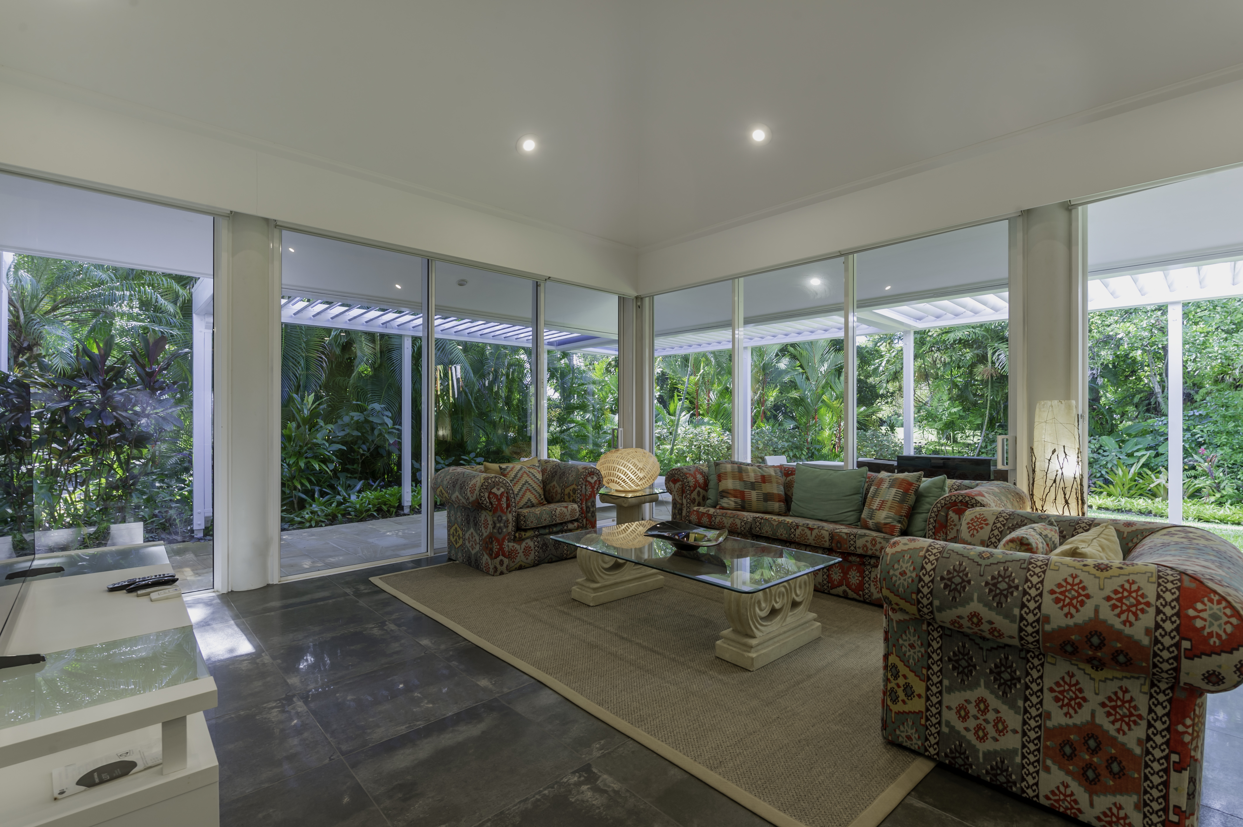The wrap around verandah is covered by an all weather roof - motorised and able to be opened up for filtered shade or closed in the rain – perfect for the tropics